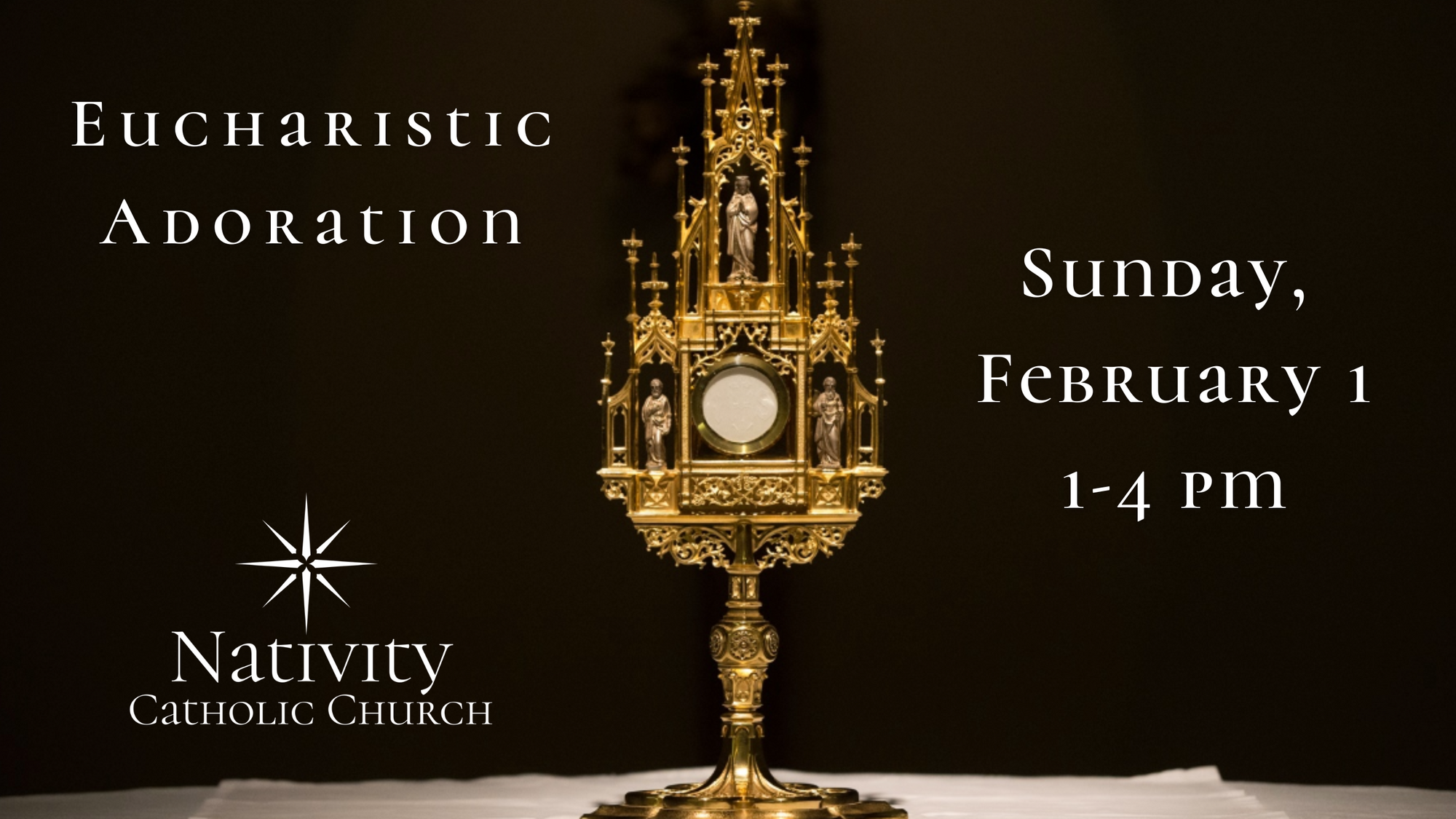 Our First Sunday Eucharistic Adoration will be held each first Sunday of the month at Nativity from 1-4 pm. During this time, volunteers are needed to spend 30-minute shifts during the 1st Sunday Adoration in prayer in the presence of the Blessed Sacrament, which is not to be left alone while exposed for Adoration. Confession will be available from 1-2 pm.