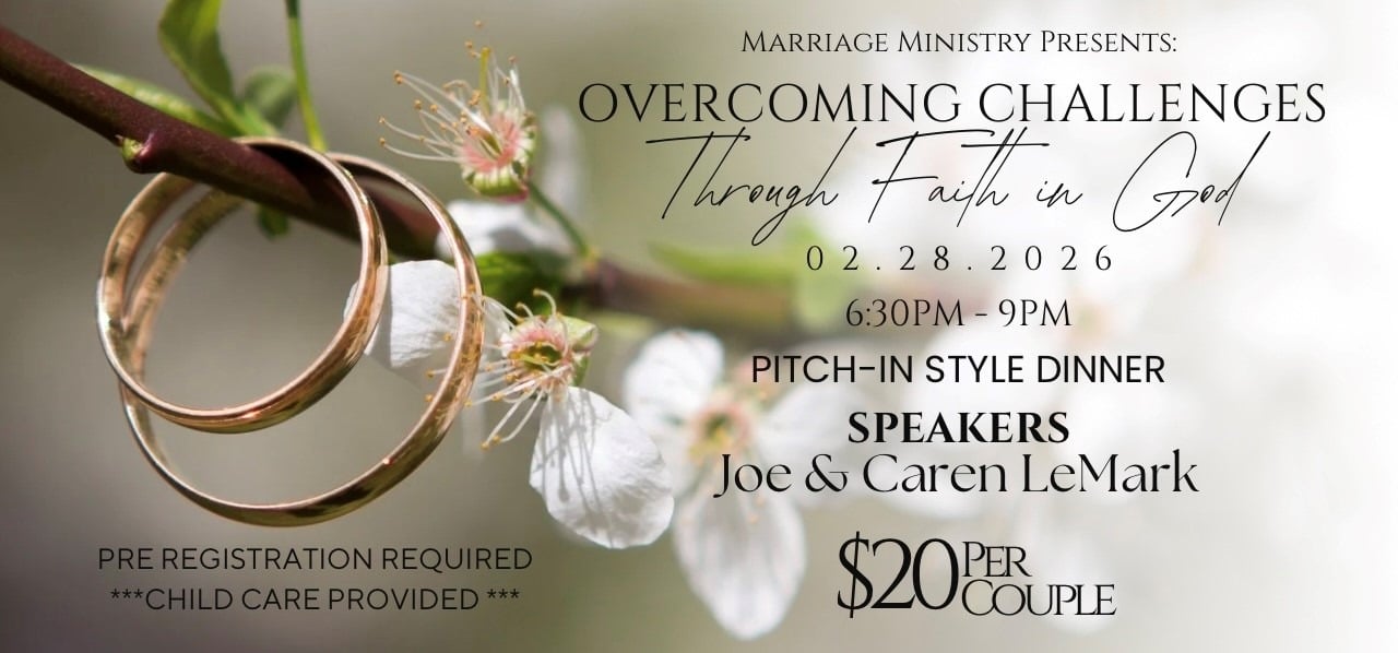 The Marriage Ministry invites all married couples to join us for our a Marriage Ministry Event - Overcoming Challenges through Faith in God - on Saturday, February 28, from 6:30-9 pm. Speakers Joe and Caren Le Mark will share their witness and encouragement.