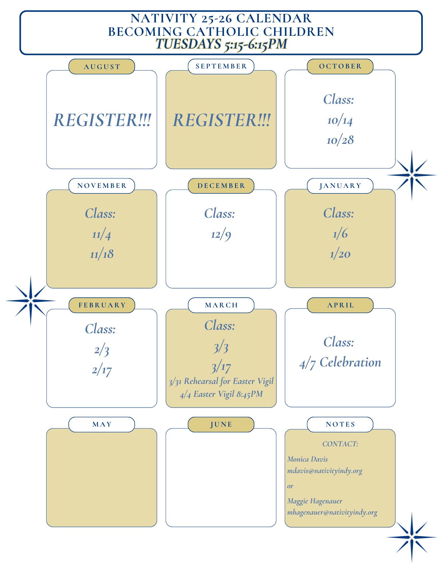 Nativity offers an opportunity to come together in a small group to learn more about our faith. Sessions will be held on Tuesday evenings from 6:45-8pm beginning on September 19, 2025, and focus on the teachings and experience of the Church and prepare individuals to celebrate the Sacraments of Baptism, Confirmation, and Eucharist during the Easter season. You are welcome to participate in the process with your questions, your insights and your faith story in a warm, accepting setting. If interested, please fill out the form!